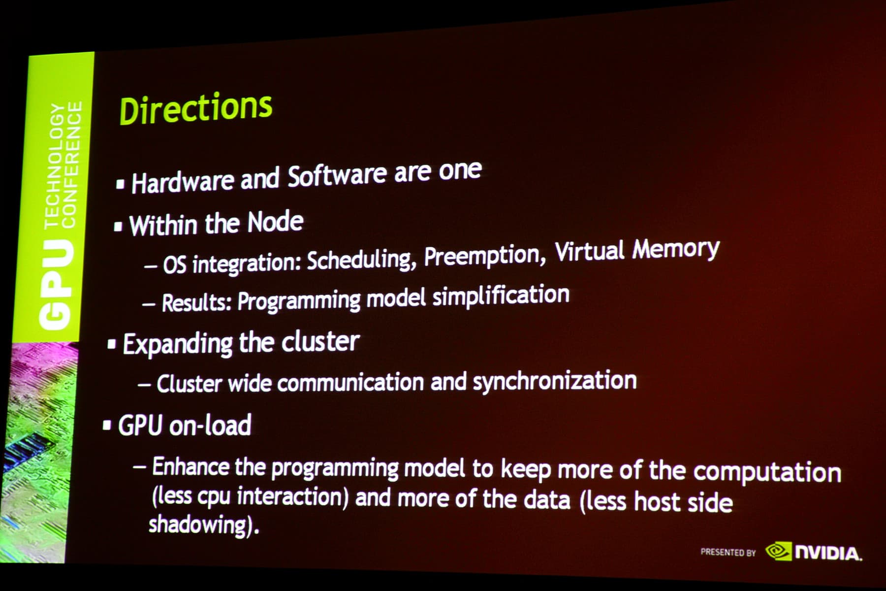 Я не буду приводить все слайды, большая часть была посвящена именно истории графических чипов, которую наши читатели обязаны знать и так. А самым любопытным показалось видение будущих архитектур GPU, предназначенных для вычислений общего назначения: ещё большая интеграция аппаратных и программных средств, виртуальная память, улучшения в коммуникациях и снижение зависимости от CPU.