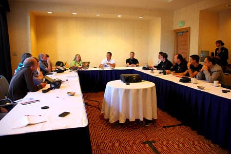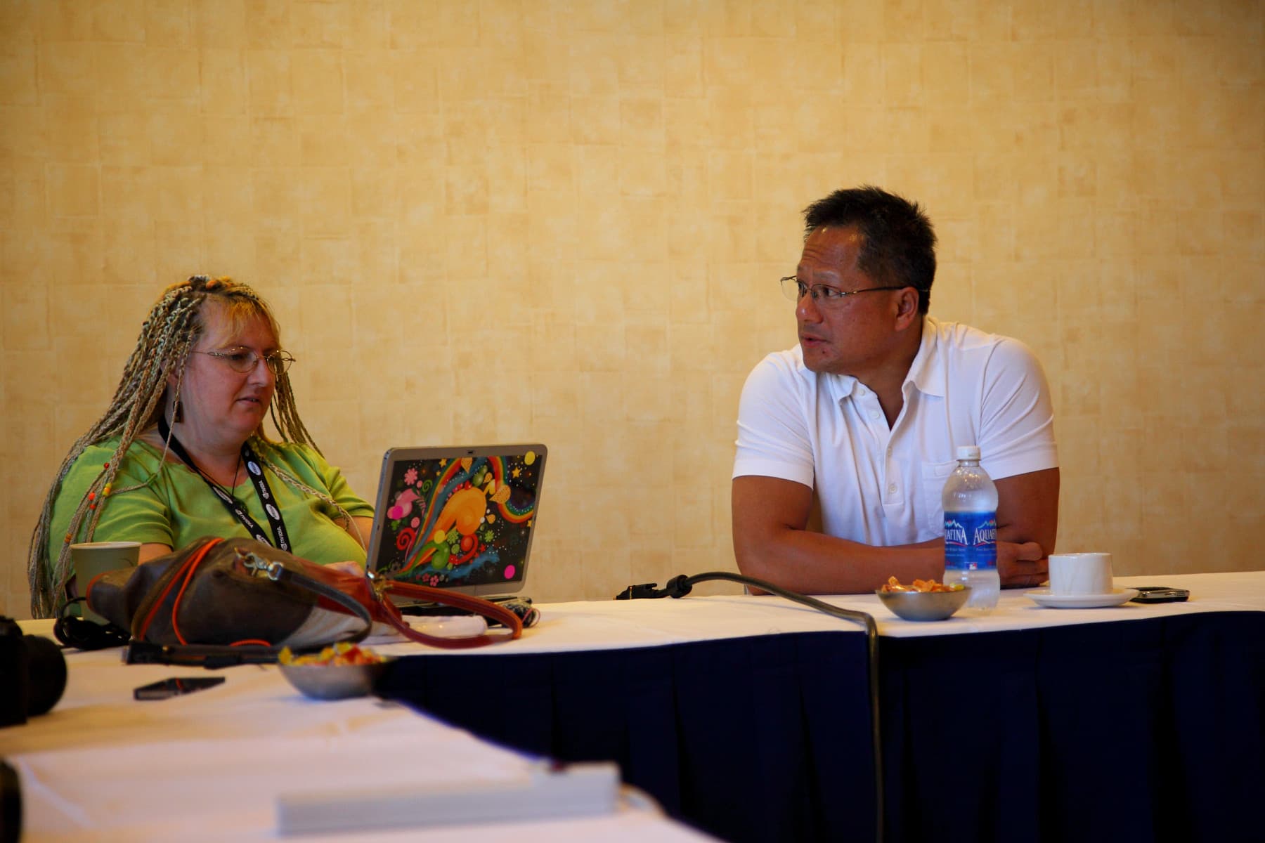 После keynote у отобранных тщательнейшим образом журналистов появилась редкая возможность расспросить Дженсена Хуанга, задав в специальном интервью все животрепещущие вопросы, засевшие в журналистских головах в процессе GTC. Надо сказать, что публика в лице нашего брата была весьма разношёрстная (и забавная — см. фото) и вопросы в основном были общего характера, без особой специфики.