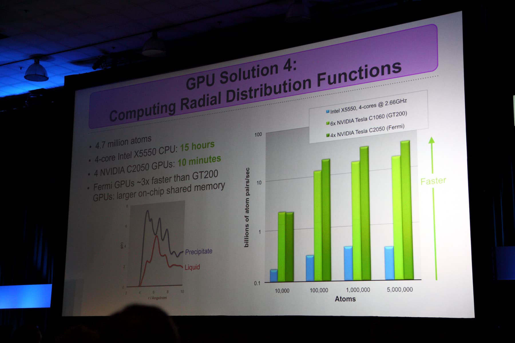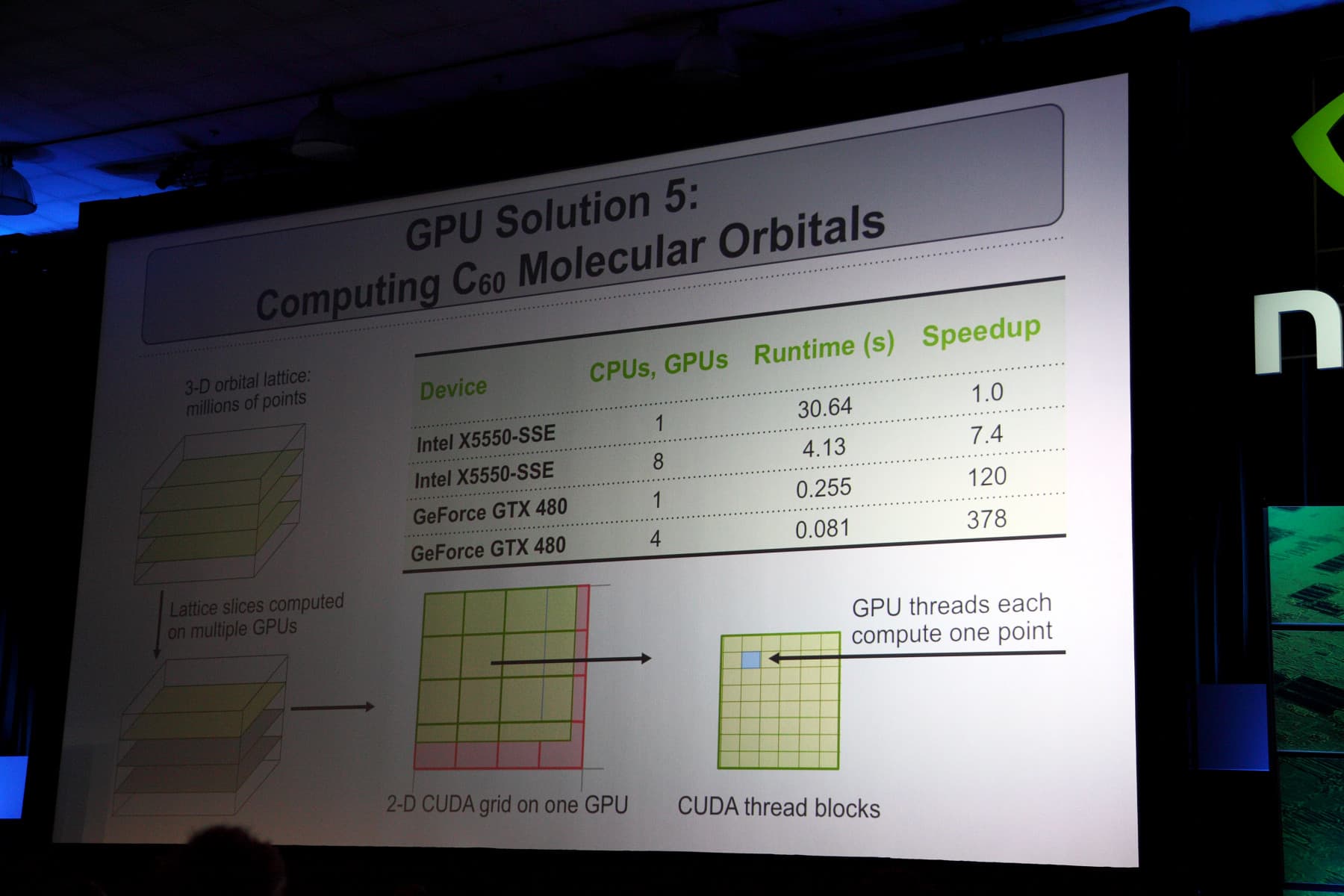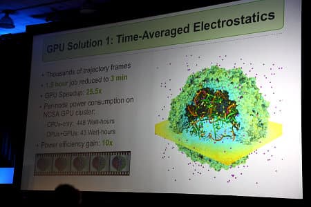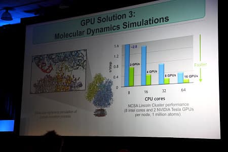 Его обширное выступление было целиком посвящено тому, как вычисления на GPU используются в науке. И оказывается, что исследователи нашли уже очень много применений GPU вычислениям. Не будем описывать всё выступление, его всегда можно посмотреть в онлайне на сайте Nvidia, а только ознакомим читателей с наиболее интересными слайдами с практическими данными о производительности расчётов на GPU.