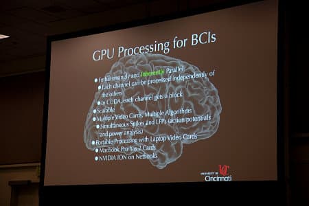Каким образом всё это касается GPU? Графический процессор помогает в расчётах, как всегда. Ведь сигналов с мозга снимается довольно много и всё это нужно обрабатывать в реальном времени, а желательно ещё и увеличить количество каналов по сравнению с тем, что рассчитывается на CPU. Да и перед специализированным аппаратным обеспечением у GPU есть определённые преимущества.