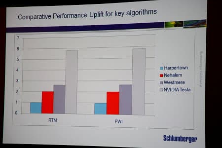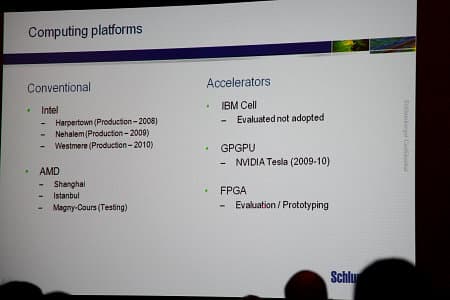 Интересно, что компания Schlumberger использует разные вычислительные платформы, в качестве универсальных процессоров применяются архитектуры компаний Intel и AMD, а вот ускорители вычислений не все смогли показать свою применимость. Лишь GPU оказались довольно успешны в этом деле, показав кратные приросты в скорости, по сравнению с лучшими CPU: