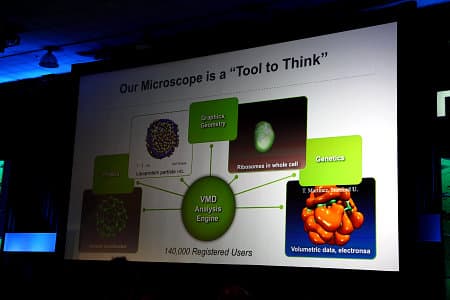 Ну а сегодня мы продолжим отчёт со второго дня. Как всегда, всё начинается с ключевого выступления дня в большом зале и с глобальными темами. В этот раз на keynote выступал Klaus Schulten — профессор физики и директор группы теоретической и вычислительной биофизики в Иллинойском университете в Урбана-Шампейн.