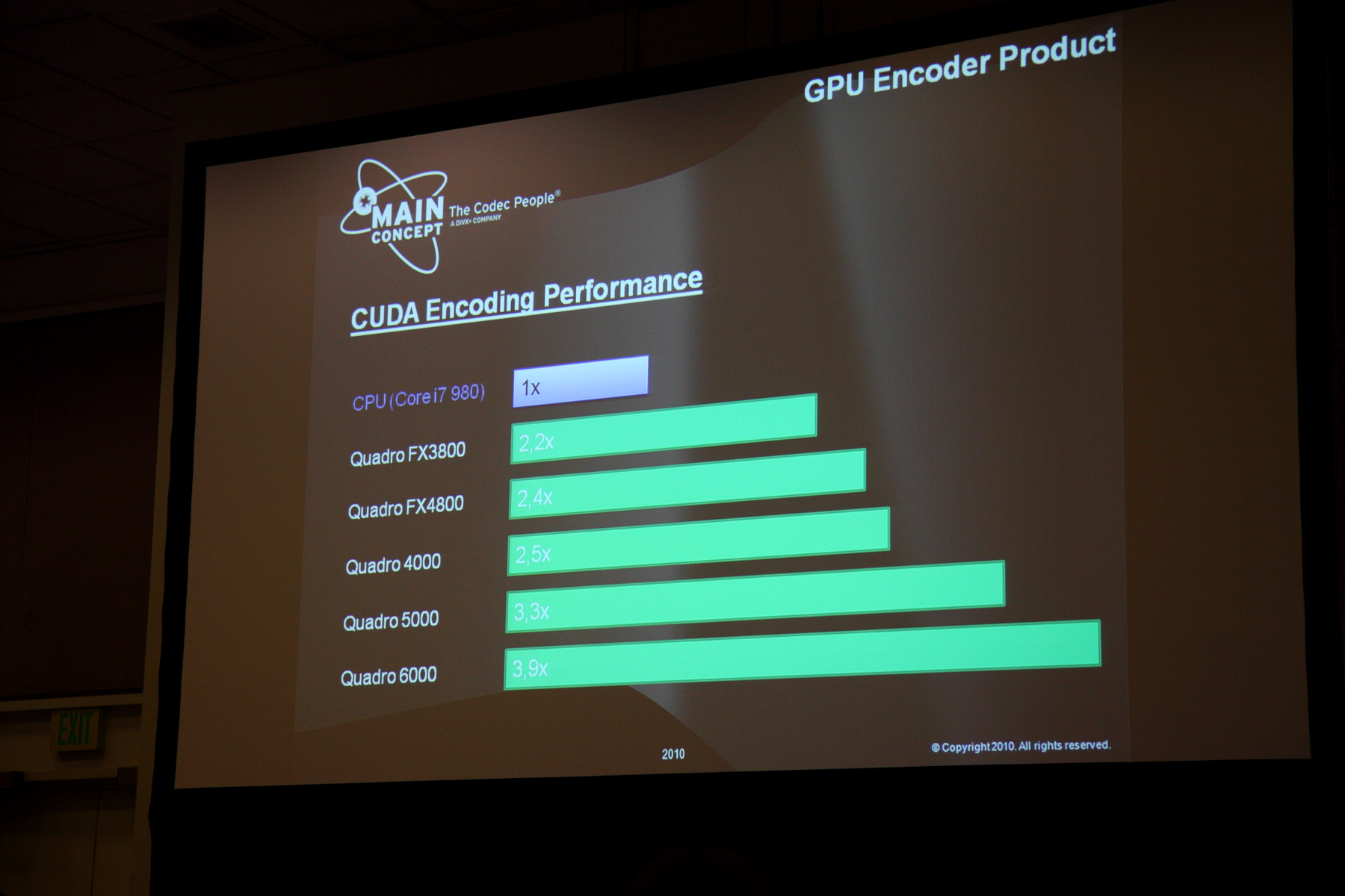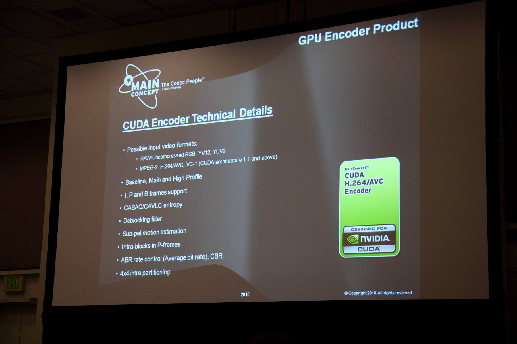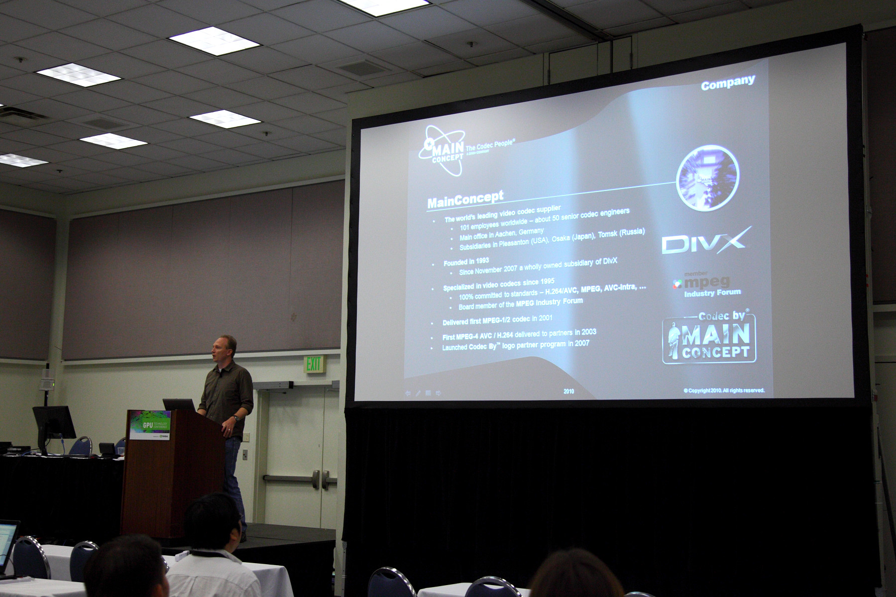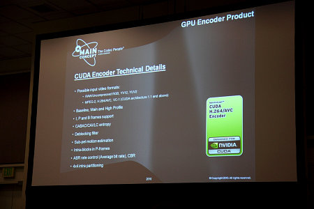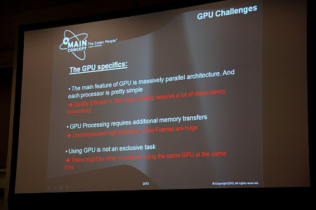 Две следующие сессии были посвящены, по сути, одной и той же животрепещущей теме — кодированию видео в формате H.264 при помощи GPU. Мне тема показалась интересной, тем более что на одной из сессий выступал представитель российского офиса Nvidia. Но первой по порядку была презентация известной компании Mainconcept.