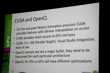 Лично меня особенно заинтересовали практические вещи, о которых говорил представитель компании. В частности, о том, что они выбрали Nvidia CUDA из-за того, что это хорошая платформа, значительно более производительная чем CPU и с широкой аудиторией в виде миллионов видеокарт, проданных по всему миру. А для GPU других производителей можно использовать OpenCL. Но есть в переносе видеокодирования на GPU и определённая специфика и проблемы: