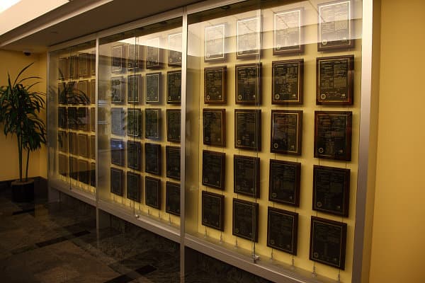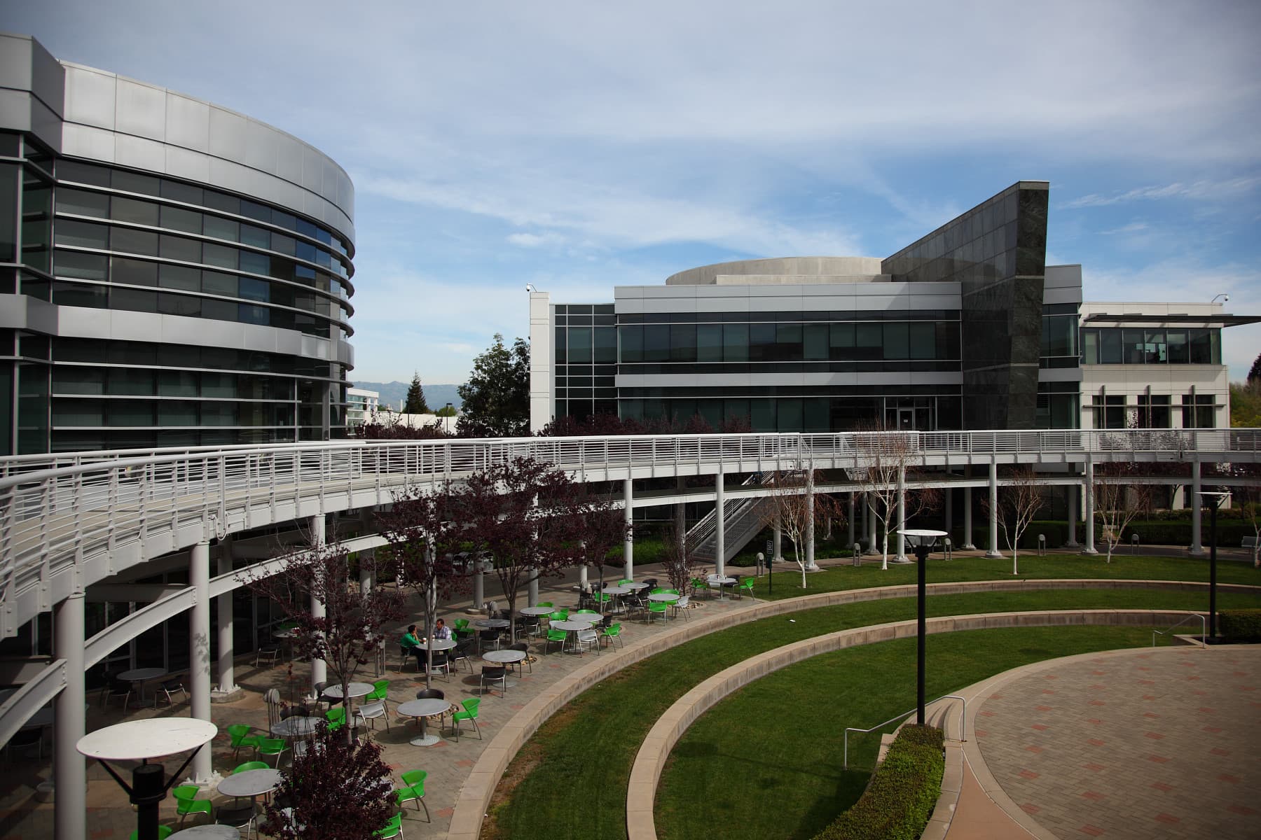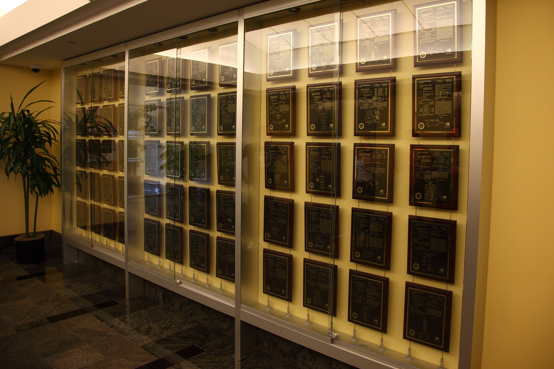 Офисные здания и растительность вокруг них ухожены и выглядят весной очень красиво — по всей территории цветут вишнёвые деревья, а зелень всё ещё молода и свежа. Путь посетителя в основном здании Nvidia начинается со списка достижений, среди которых представлены как самые важные патенты компании (не все, естественно — так как всего их несколько тысяч), так и кубки и другие экспонаты, полученные за всё время работы: