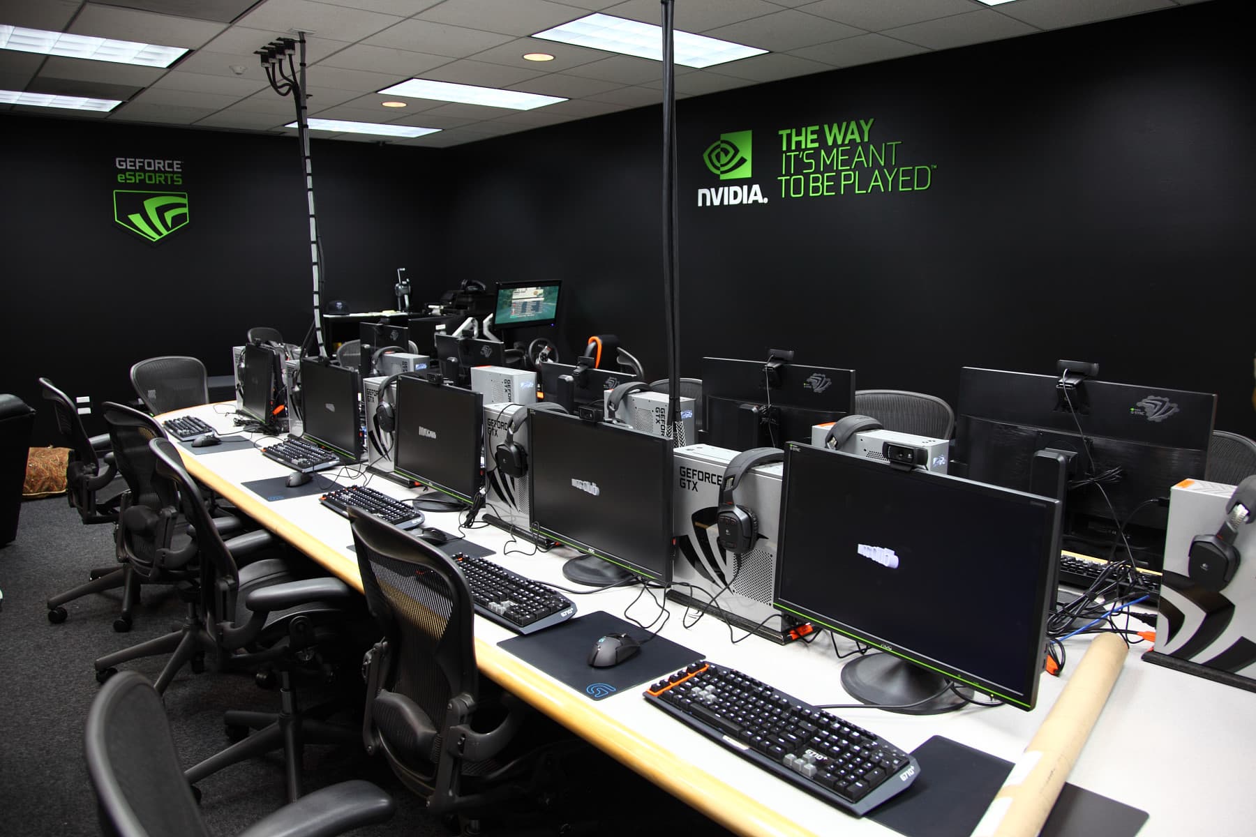 Ещё одной комнатой, которую мы посетили и фотографиями из которой можем поделиться, была комната eSPORTS — как вы знаете, под эгидой Nvidia проводятся разнообразные соревнования по сетевым играм, в том числе и World of Tanks, кстати. А комната представляет собой неплохо оснащённый всем необходимым центр для проведения подобных турниров.