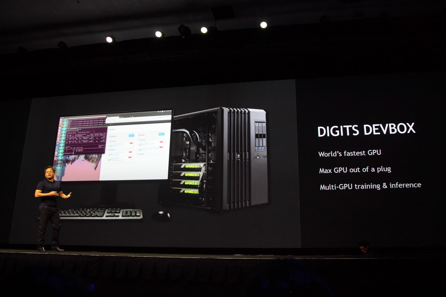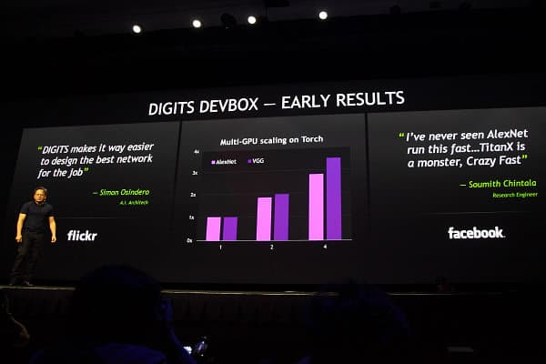 В ходе своего главного выступления, Дженсен анонсировал также и DIGITS и DIGITS DevBox — новые возможности для простого и быстрого построения глубоких нейросетей, которые предлагает Nvidia. Использование нейросетей при тренировке машинных алгоритмов для самостоятельного обучения, классификации и распознавания объектов, является непростой и требующей серьёзной работы задачей. Эта тема сейчас является одной из самых обсуждаемых, и GPU-ускоренный deep learning используется в работе множества компаний: