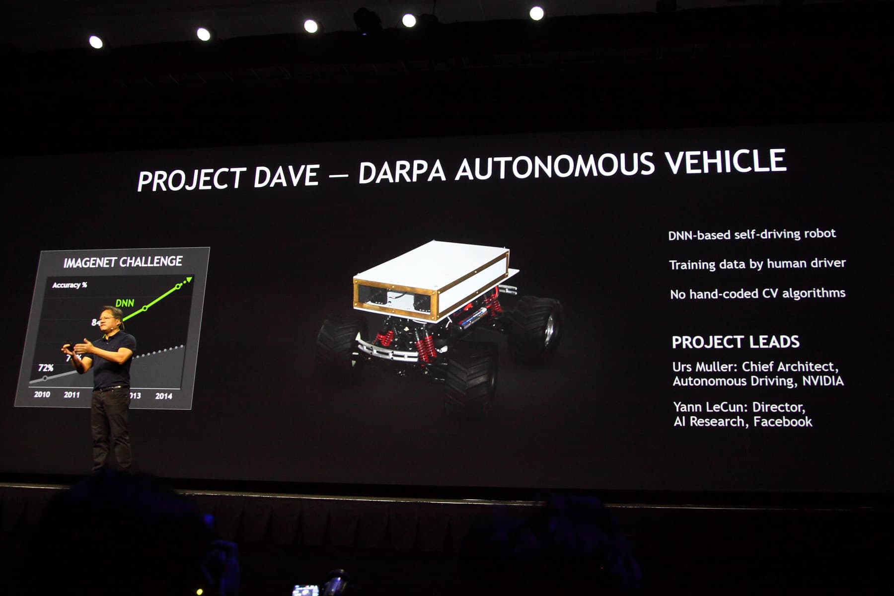 Развивая тему глубокого обучения, показали её применимость и для полностью автономного управления движущимся транспортом. Пока что это был не полноразмерный автомобиль, но небольшой самодвижущийся агрегат из проекта Dave: