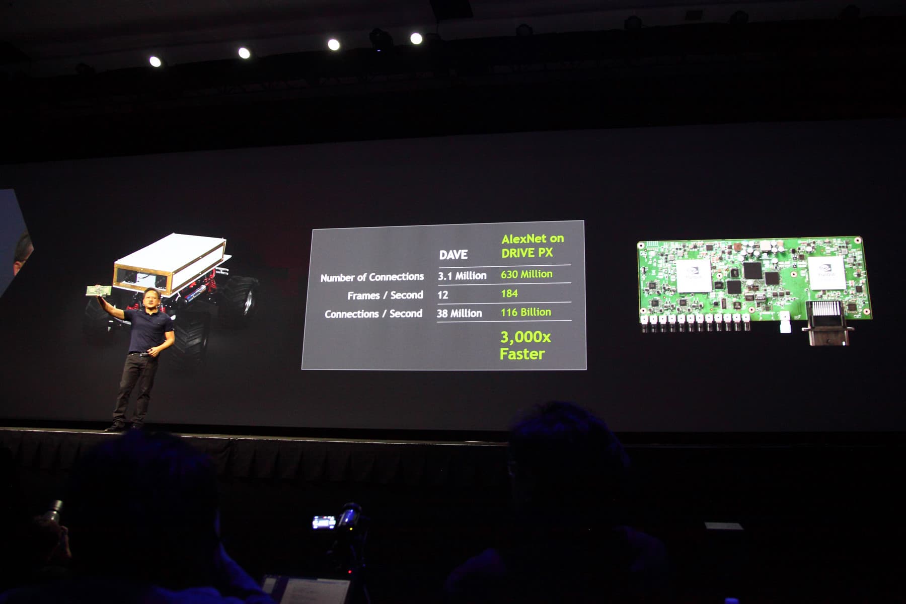 Чем лучше обучена нейросеть, тем более правильные решения принимает эта машина. В проекте Dave используется нейросеть с 3.1 миллионами соединений при 12 кадрах в секунду, получаемых с камеры, а внедрение аналогичной системы на базе нейросети AlexNet и применении аппаратного обеспечения Drive PX от Nvidia, можно поднять количество кадров в секунду до 184 FPS, а число соединений до 630 млн. Итоговую разницу в производительности Nvidia оценивает в 3000 раз. Если даже с меньшими возможностями робот неплохо ездит по довольно сложной пересечённой местности, то уж с Drive PX его можно обучить ездить на порядки лучше.