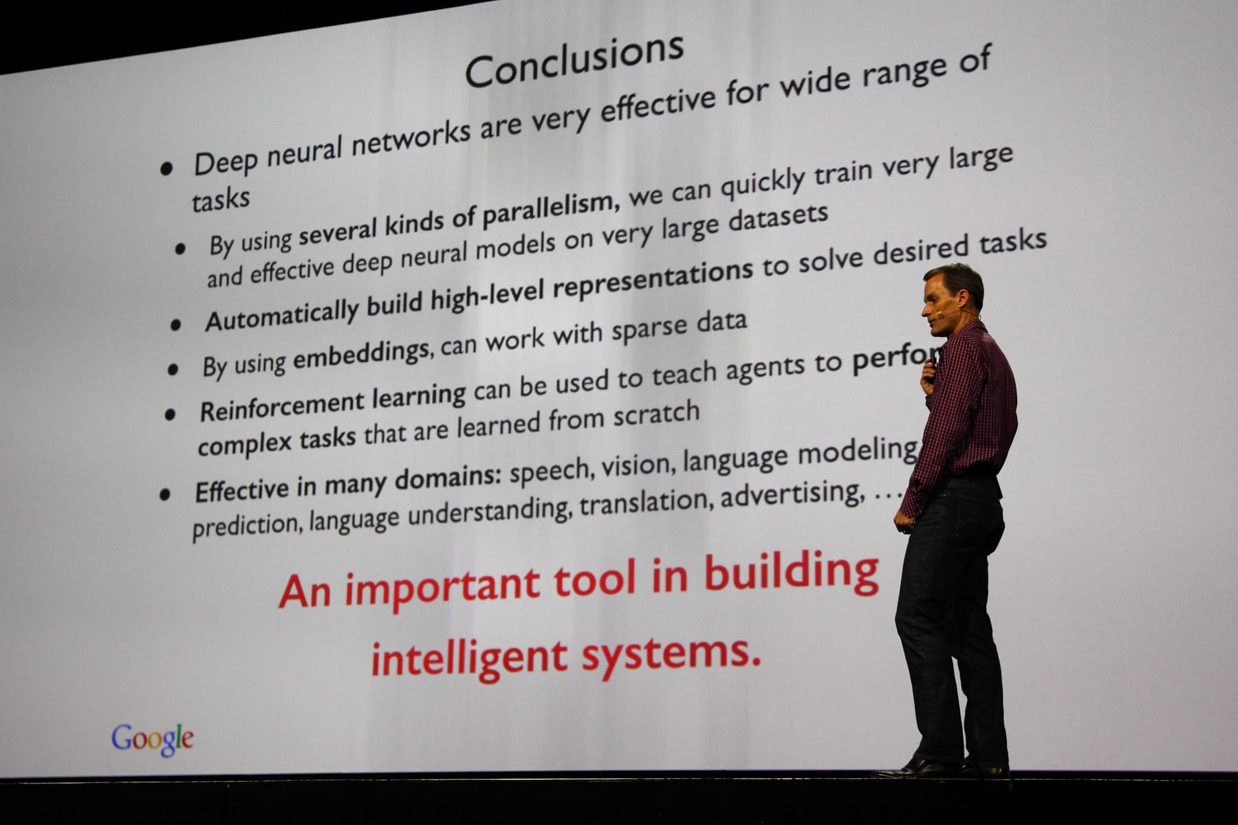 Подводя итог этой пары ключевых выступлений, отметим, что в Google и Baidu видят за deep learning большое будущее умных систем с наличием признаков искусственного интеллекта. Хорошо обученные нейросети помогут в большом количестве разнообразных задач в областях распознавания речи и изображений, моделировании, предсказании, переводе с разных языков, и многих других.