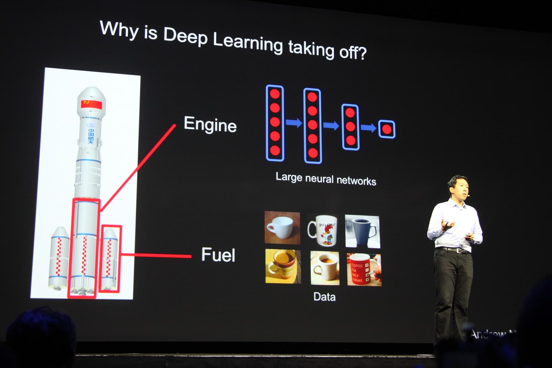 Чтобы уменьшить количество ошибок, надо лишь увеличить количество входных данных для обучения машинного алгоритма. Представитель Baidu привёл интересную аналогию, представив deep learning как ракетный двигатель, а данные для обучения нейросети — как топливо для него. Чем больше топлива для двигателя, тем большую точность и тем более богатые возможности можно получить: