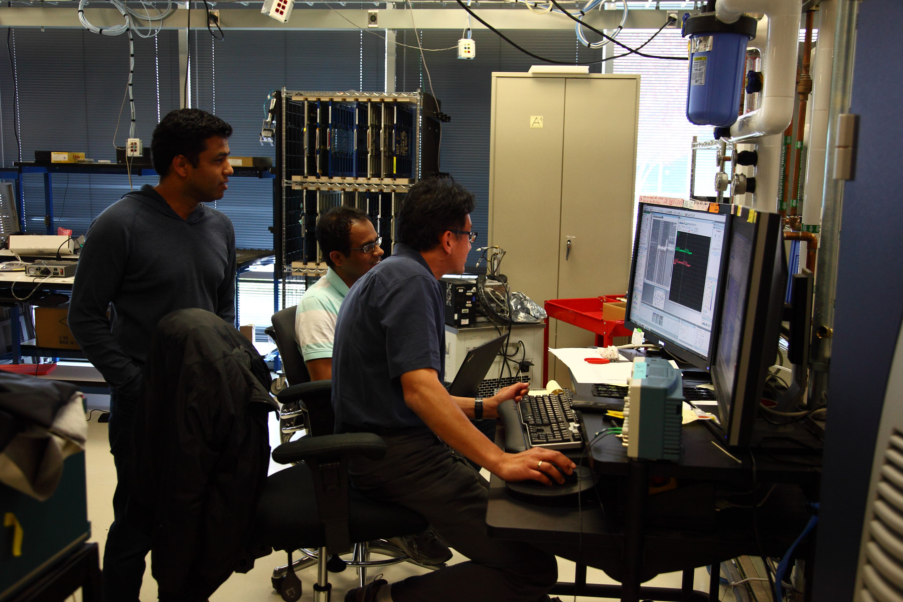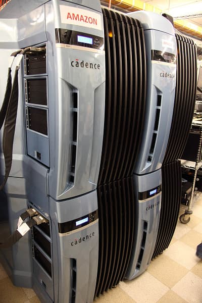 Именно в этой комнате исследуются сверхсекретные разработки, которые ещё весьма далеки от готовых решений в кремнии. Конечно же, нам их и не показывали. В работе тут используются программно-аппаратные средства от компании Cadence, которые и по размеру большие, и требуют очень много энергии и мощного водяного охлаждения, так как каждая из машин потребляет 10 кВт и более.