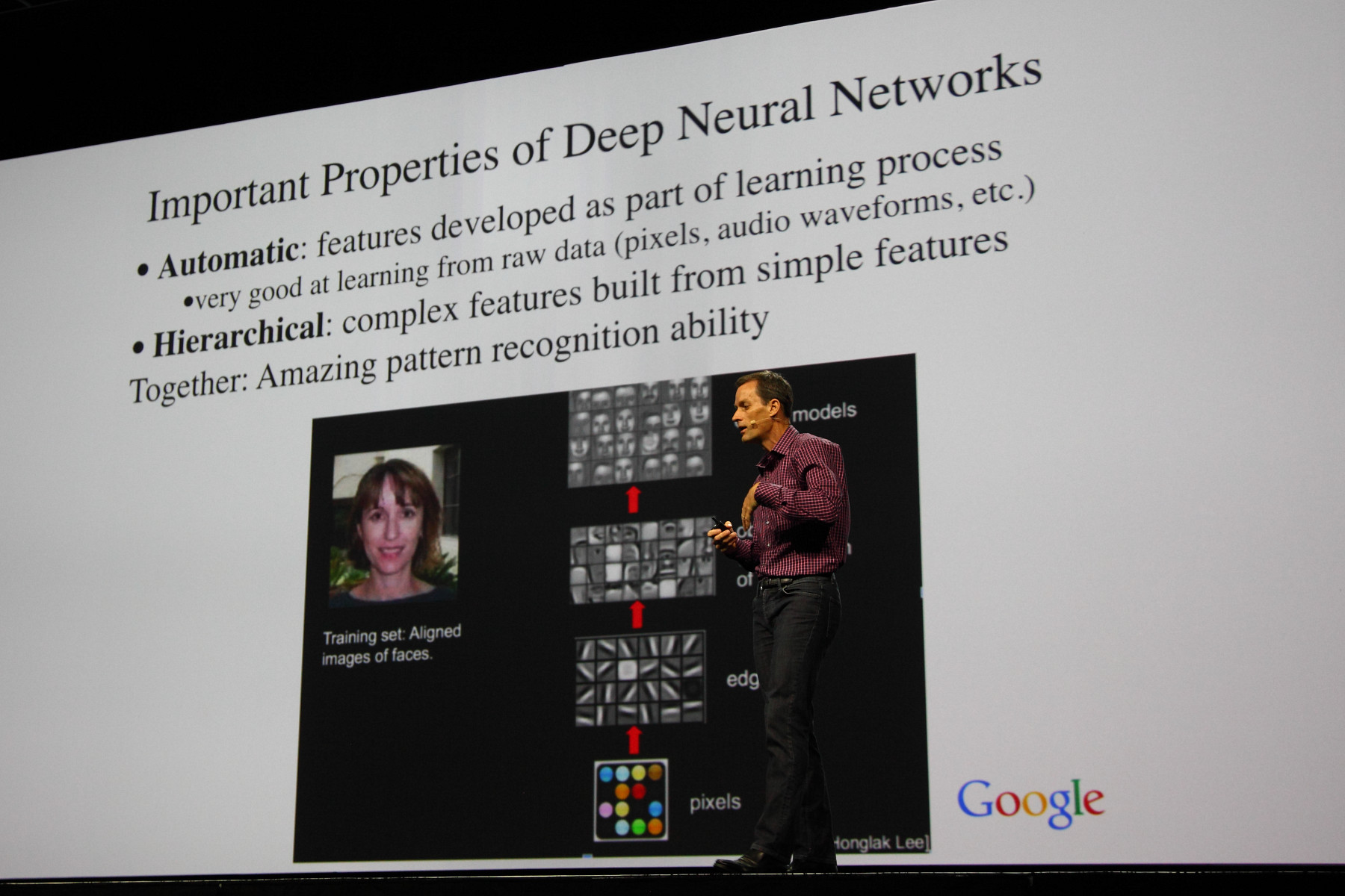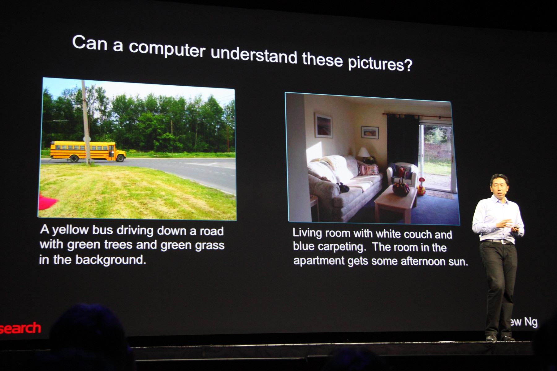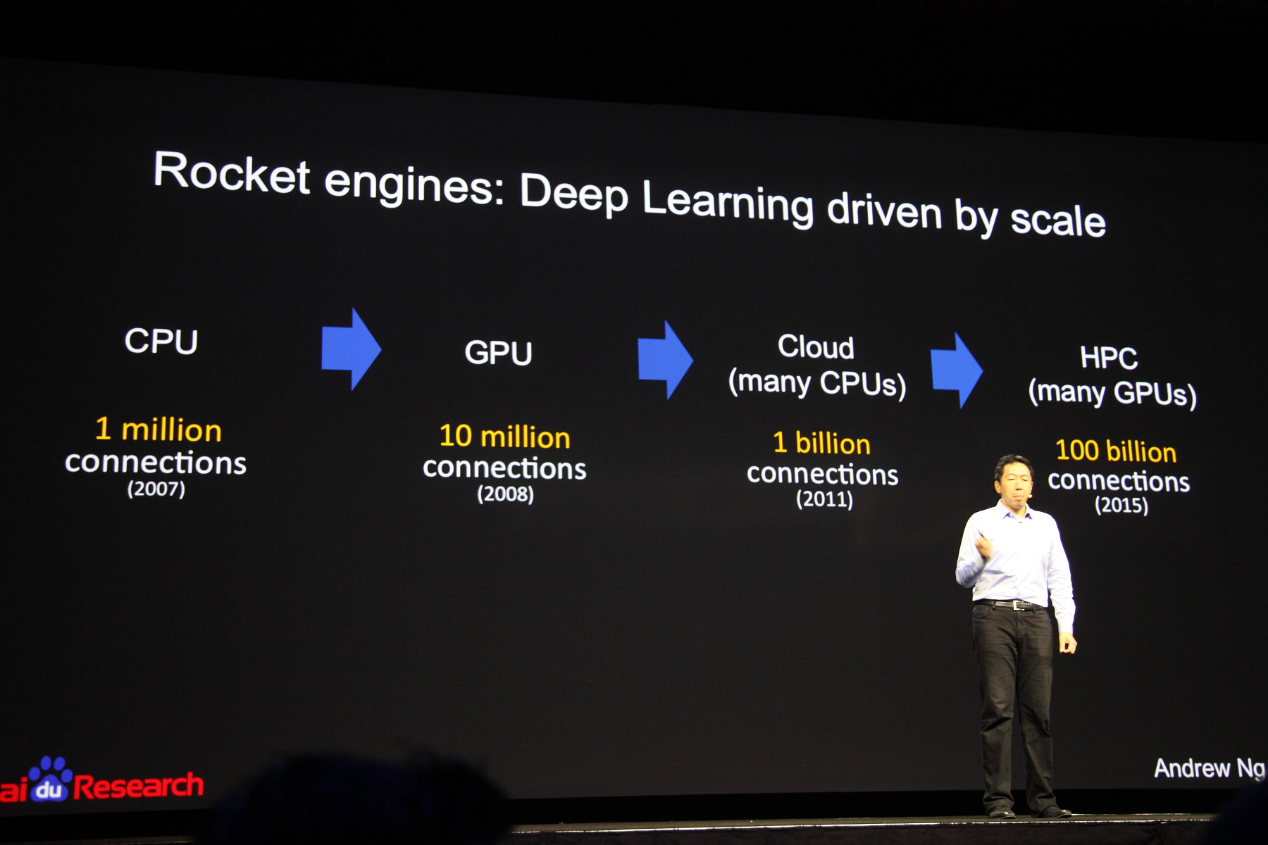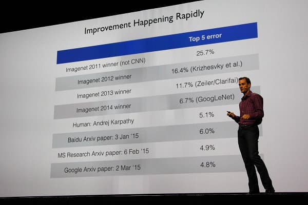 Так как главной темой конференции было глубокое обучение (deep learning) — современная реинкарнация того, что в 80-90-е годы называлось нейросетями, то и ключевые выступления других двух основных дней работы GTC 2015 были посвящены именно этому. Так, в разные дни перед тысячами посетителей выступили представители Google и Baidu (глобальный и китайский поисковики, соответственно). Их выступления во многом пересекались, что было вполне логично, так как работают они примерно над одинаковыми проблемами.