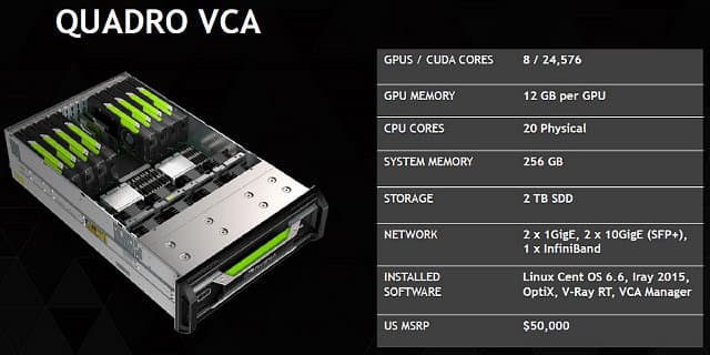 Ну и последним анонсом на GTC, связанным с профессиональной 3D-графикой, стало обновление Quadro Visual Computing Appliance (VCA) — теперь эта система может включать до восьми видеокарт, аналогичных свежеанонсированной Quadro M6000, что даёт потрясающий прирост скорости в задачах 3D-рендеринга, в том числе и в упомянутом Iray 2015.