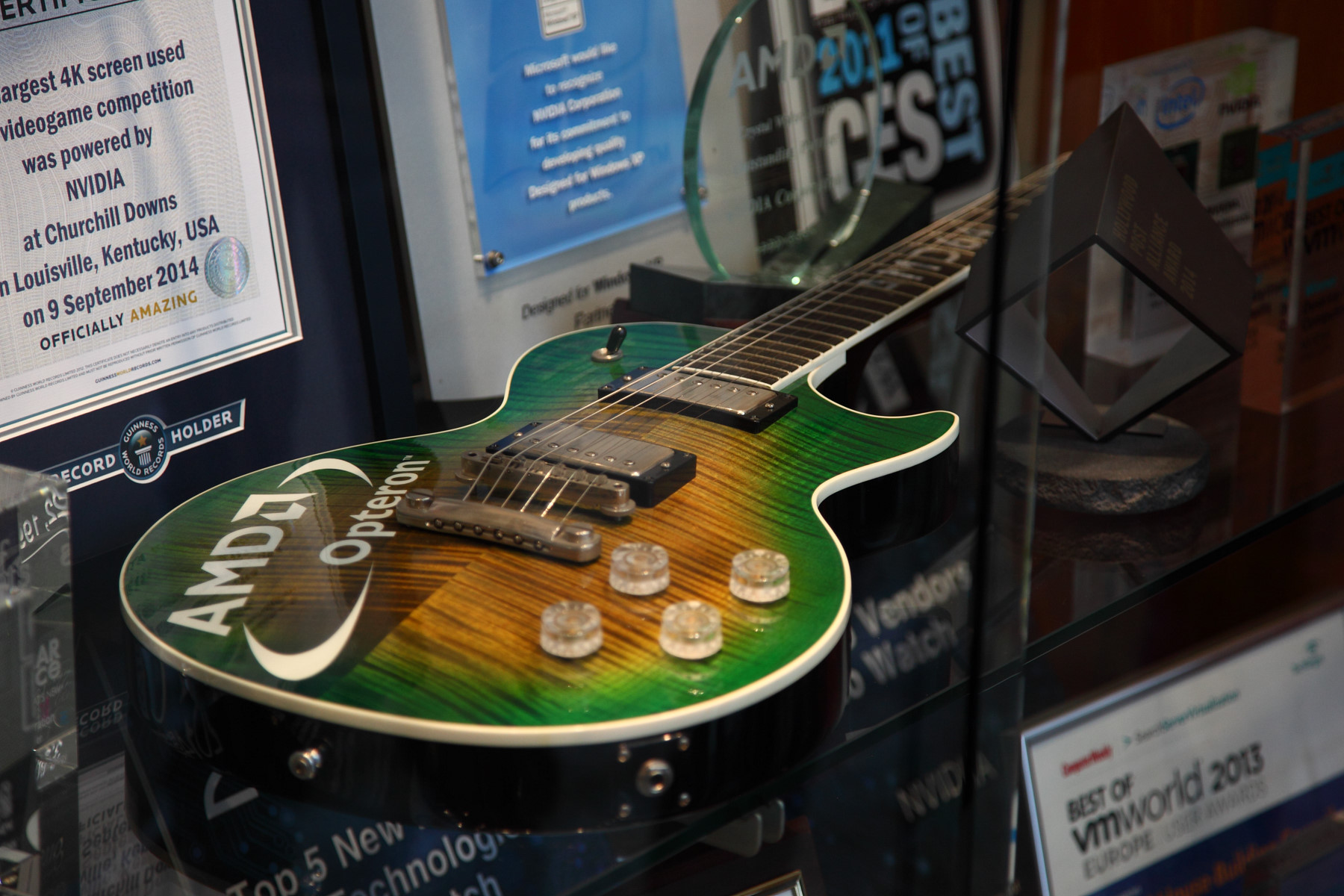 Самым забавным трофеем среди выложенных можно посчитать гитару с логотипом AMD Opteron, которая вызывает всеобщий интерес. Всё очень просто — в своё время, ещё до приобретения ATI компанией AMD, компании были партнёрами и тесно взаимодействовали друг с другом, и ничего особенного в этом нет.
