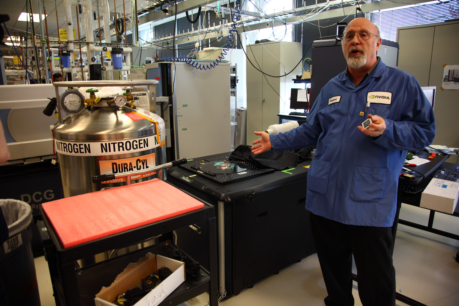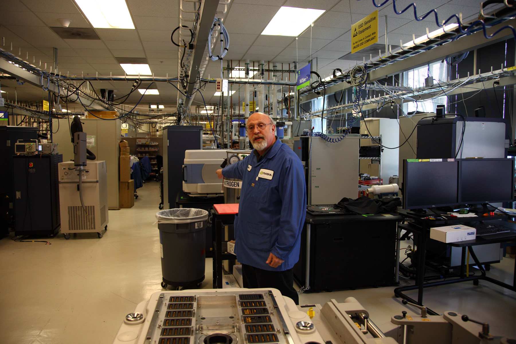 Первой комнатой, которую посетили журналисты, стала тестовая лаборатория Nvidia с говорящим названием Failure Analysis Lab, где различные чипы компании подвергаются тщательному анализу на предмет каких-либо физических проблем — вроде токов утечек (leakage) и т.п. Именно тут определяют проблемные участки первых ревизий GPU и других микросхем Nvidia.