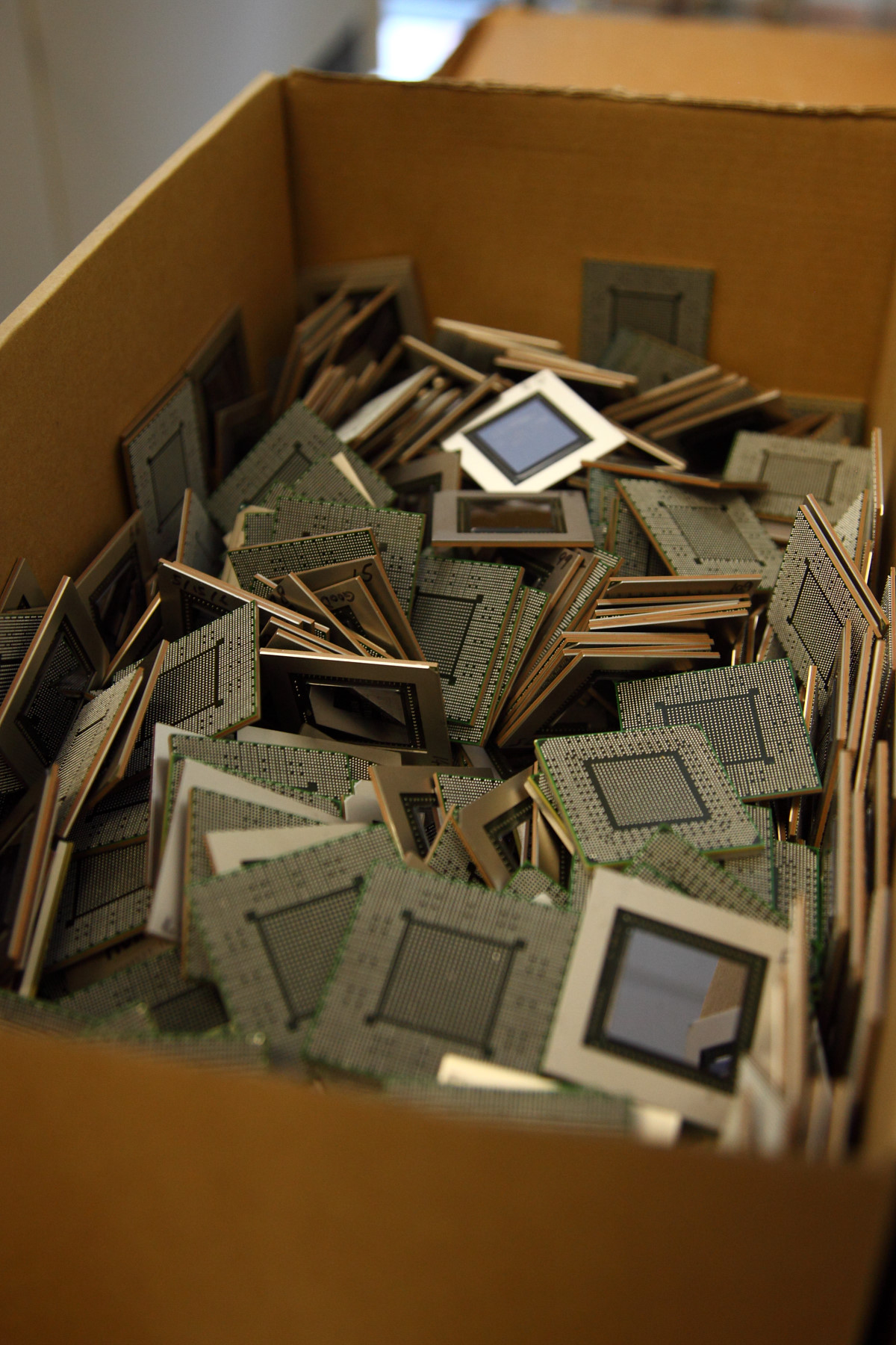 Так как речь идёт о лаборатории анализа неудачных чипов, то неудивительно, что вокруг полно бракованных GPU уже известных нам серий — например, вот большая коробка с нерабочими чипами GK210, которые использовались исключительно в профессиональных системах для вычислений Tesla:
