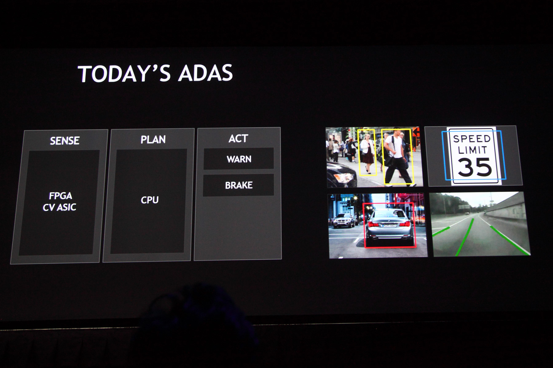 Этой мощи вполне достаточно для того, чтобы получать и анализировать визуальные данные с 12 камер, что позволяет одновременно использовать широкий набор вспомогательных систем, предназначенных для облегчения работы водителей: просмотр всего пространства вокруг автомобиля, предотвращение столкновений, определение пешеходов и избежание наездов на них, управление без применения зеркал внешнего вида, мониторинг автомобильного трафика вокруг автомобиля и многое другое. На стенде Nvidia стояло несколько рабочих макетов, показывающих Drive PX в работе:
