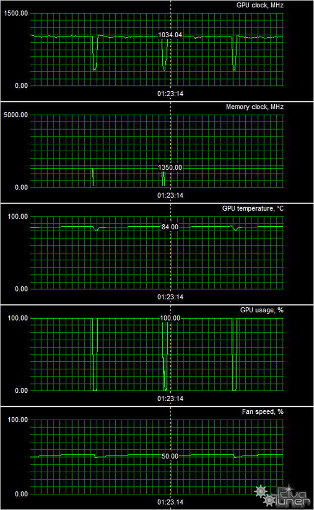 После 6-часового прогона под нагрузкой максимальная температура не превысила 84 градуса, что является очень хорошим результатом для такого мощного ускорителя! И следует также отметить, что СО при этом почти не шумела.