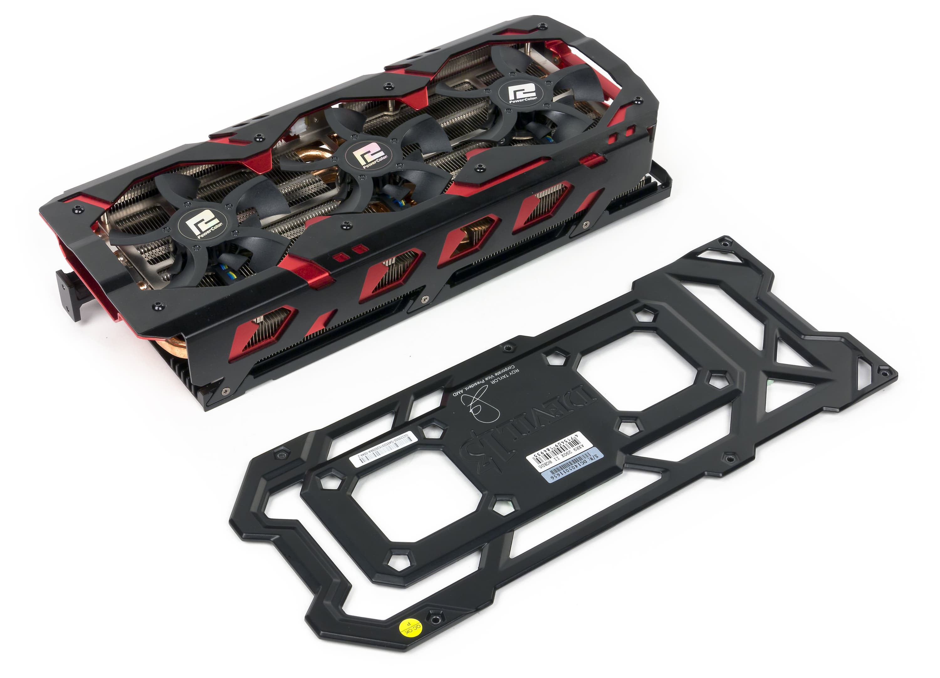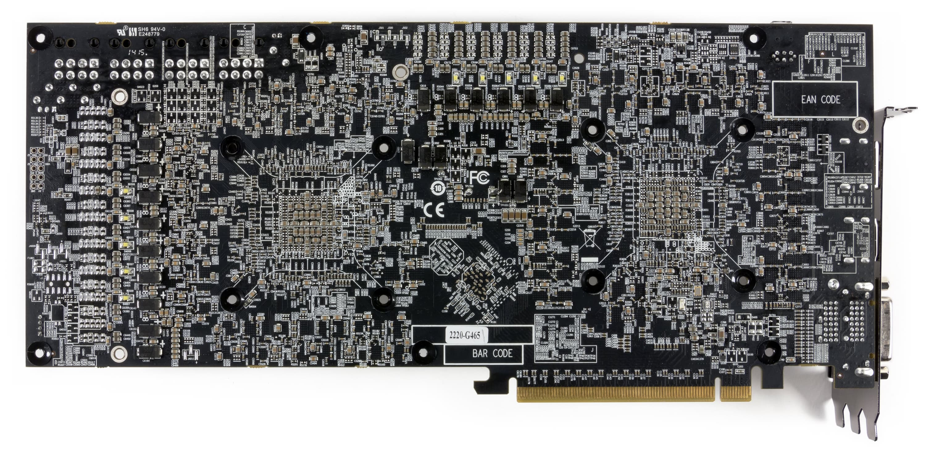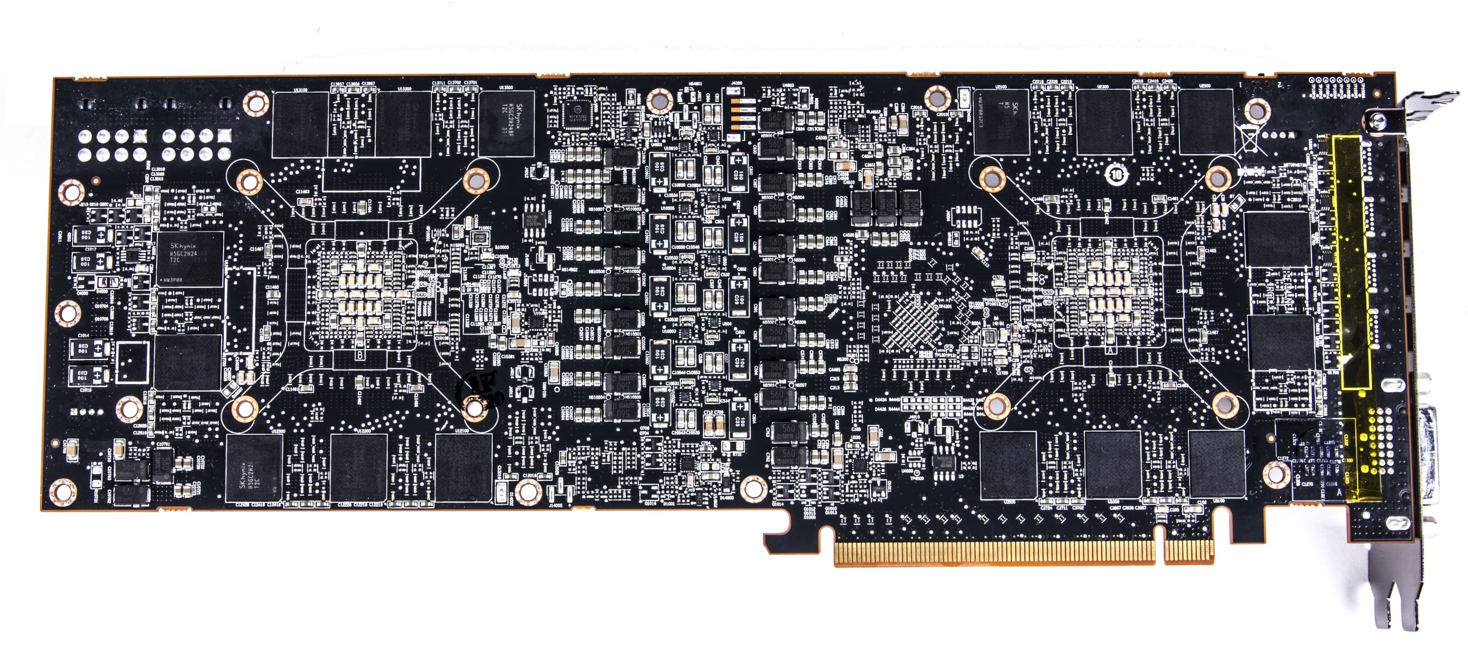Инженеры Powercolor полностью переработали дизайн, плата получилась просто огромной, особенно по высоте. Специалистам удалось невозможное: разместить 32(!) микросхемы памяти на одной стороне PCB! Плюс очень сложная схема питания ядер, имеющая 6+6 фаз, а также не менее сложная схема питания микросхем памяти. Очевидно, что силовой блок спроектирован с огромным запасом (это можно оценить уже по количеству 8-контактных разъемов питания), данный ускоритель будет нормально работать и в старых системах, имеющих поддержку лишь PCI-E 1.0, потому что потребление тока от слота PCI-E сведено к минимуму.