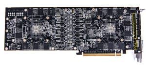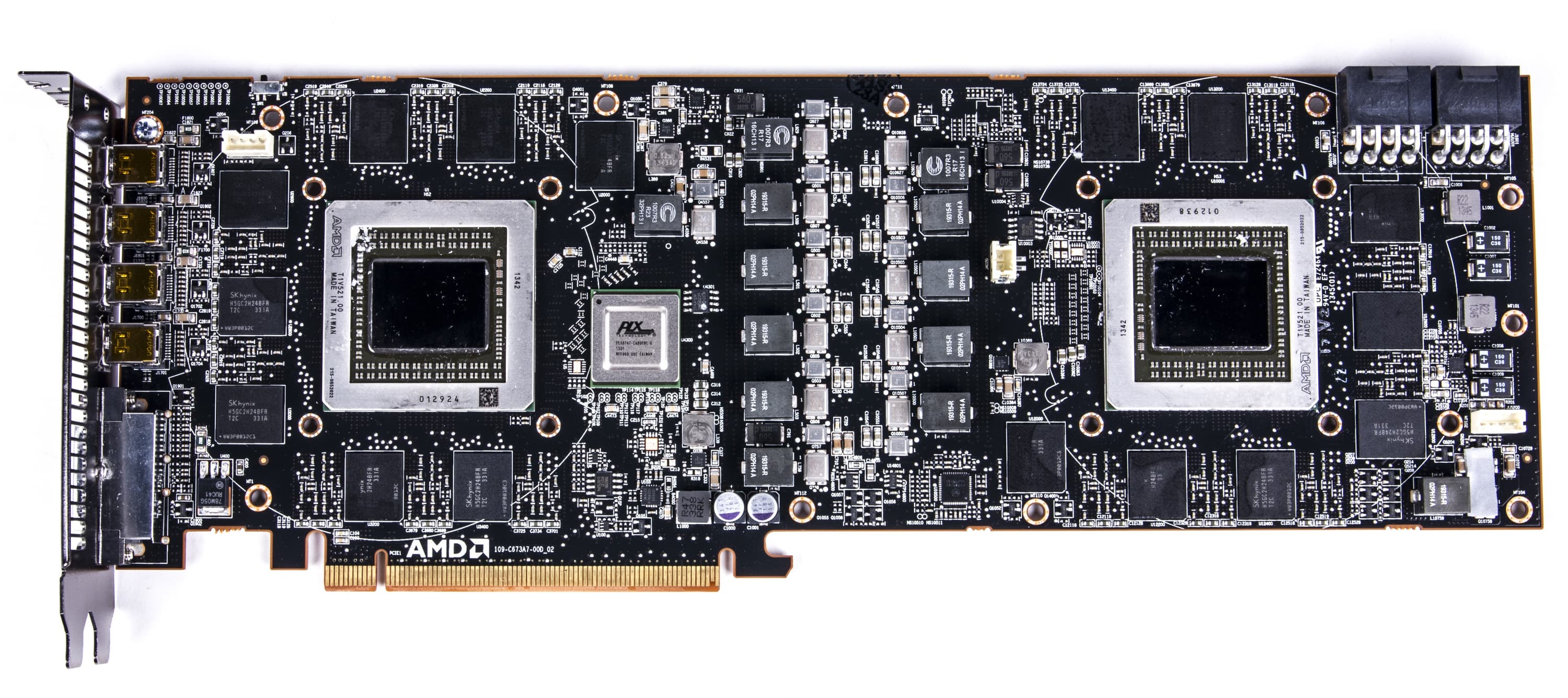 Здесь на одной плате имеется два GPU, каждый из которых расчитан на интерфейс PCI-E, поэтому, как и у остальных двухпроцессорных ускорителей, требуется коммутатор для эмуляции шины PCI-E. В нашем случае в качестве коммутатора используется пятипортовый PEX8747 компании PLX Technology.