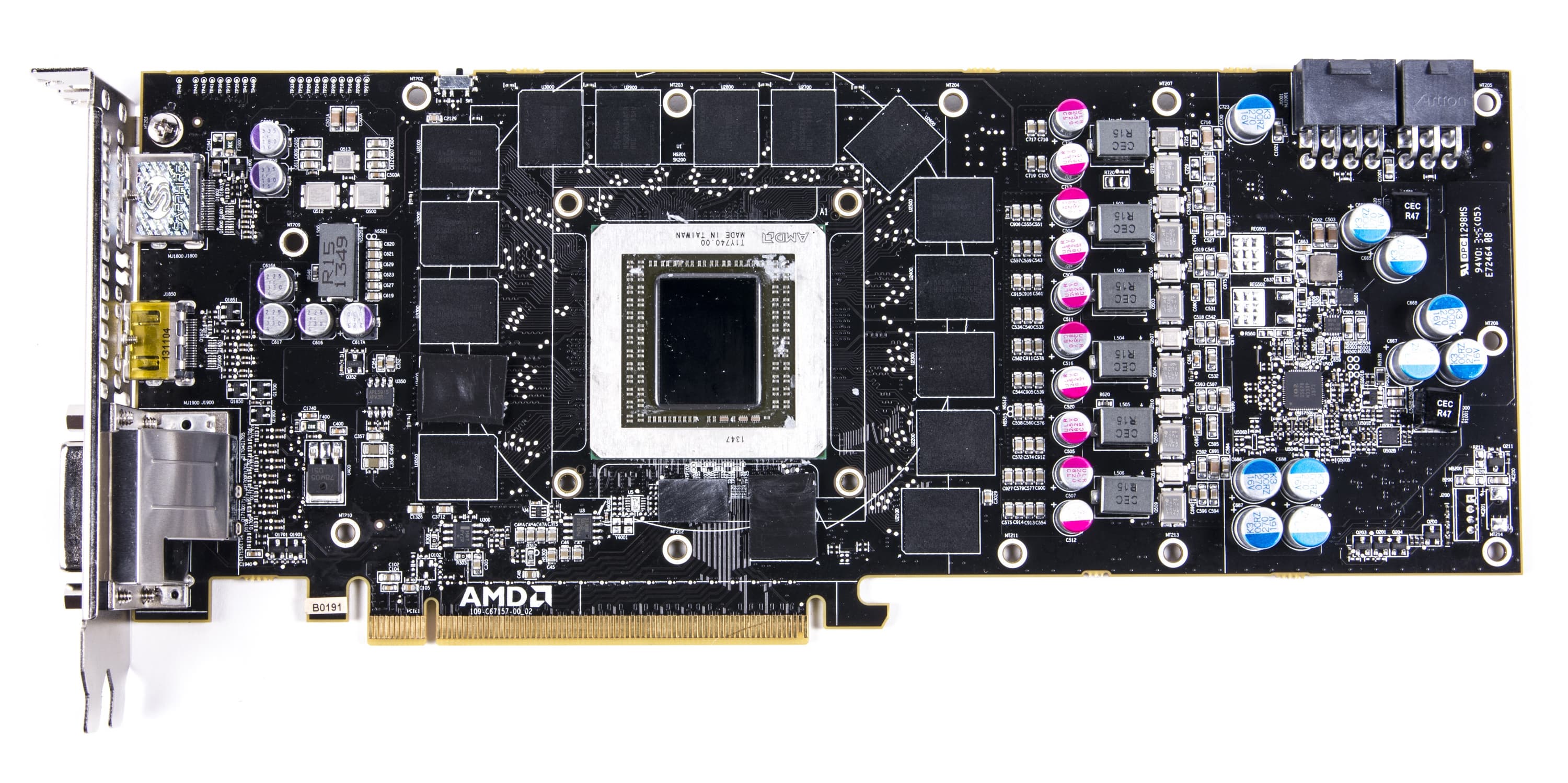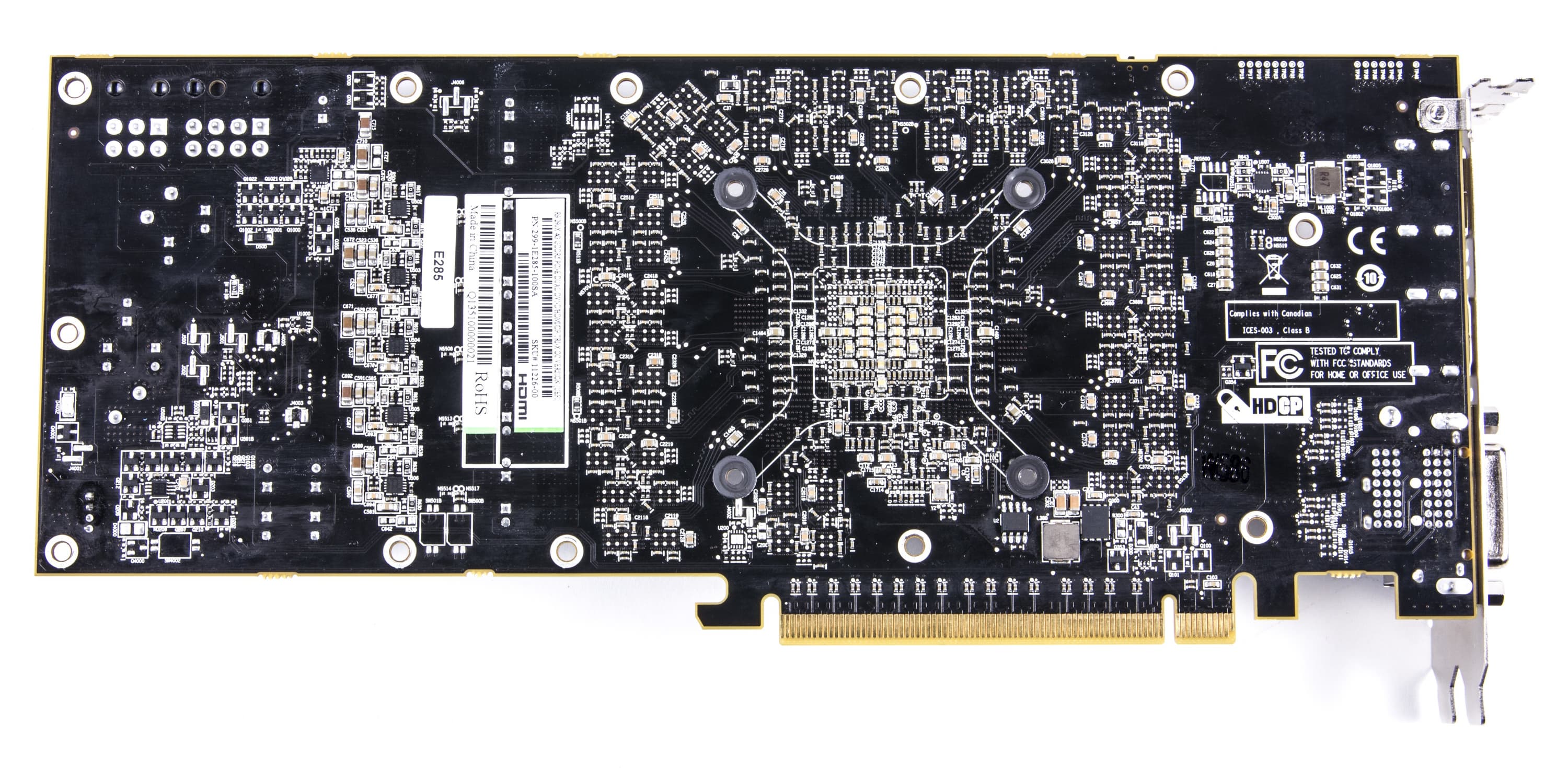 Продукт Sapphire не имеет отличий от эталонного дизайна. Более того, по логотипу AMD на PCB можно понять, что перед нами и есть референс-карта, заполучившая новую СО. Ядро на плате окружено очень плотным кольцом микросхем памяти —16 микросхем на одной стороне. Система питания — 6-фазная, управляется цифровым контроллером IR 3567B, который обеспечивает работу PowerTune. 5 фаз отводится на питание ядра, а шестая — для микросхем памяти и прочей логики. Про PowerTune мы уже писали в ранее. Стоит еще раз заметить, что видеокарта имеет переключатель BIOS. По умолчанию установлен режим Quiet (тихий), который обеспечивает более тихую работу СО, однако с потерями в производительности (впрочем, явно не существенными). Можно переключиться на режим Uber (полноценный). Мы все тесты проводим в Uber-режиме.