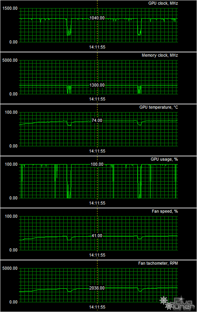 Мы провели исследование температурного режима с помощью утилиты EVGA PrecisionX (автор А. Николайчук AKA Unwinder) и получили следующие результаты: