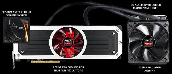 Так как даже один графический процессор Hawaii очень сильно греется, потребляя более 250 Вт в некоторых случаях, то в AMD решили использовать в двухчиповом решении систему водяного охлаждения, так как вода значительно (в 24 раза) эффективнее воздуха при передаче тепла. Если точнее, то специально сконструированное для Radeon R9 295X2 устройство охлаждения компании Asetek является гибридным, так как сочетает охлаждение при помощи воды и воздуха для разных элементов видеокарты.