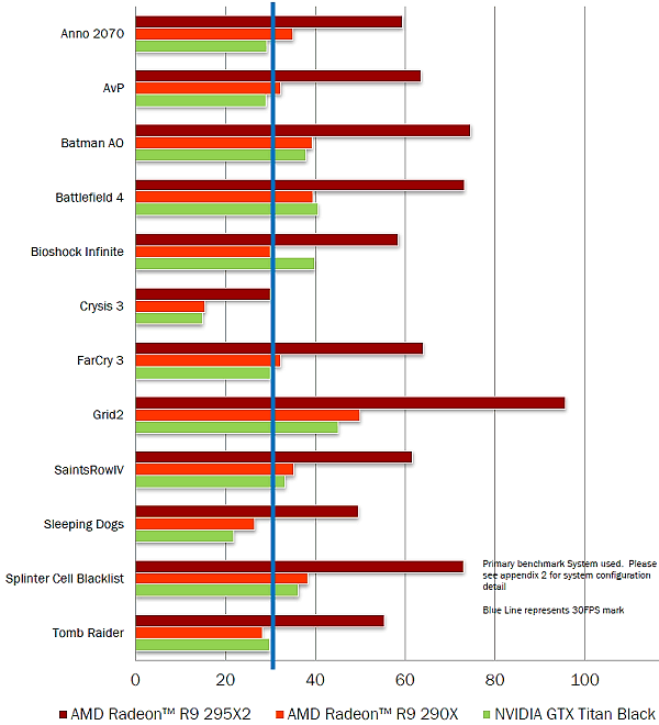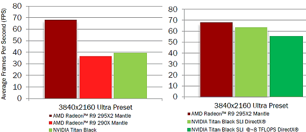 Компания выпустила очень быстрое решение, поэтому и немудрено, что они показывают его производительность, по сравнению с одночиповыми видеоплатами в высочайшем разрешении 3840×2160 и при высоких настройках, достаточных для достижения стабильных 30 кадров в секунду. И Radeon R9 295X2 обеспечивает такую производительность в большом наборе современных игр, включая самые требовательные: