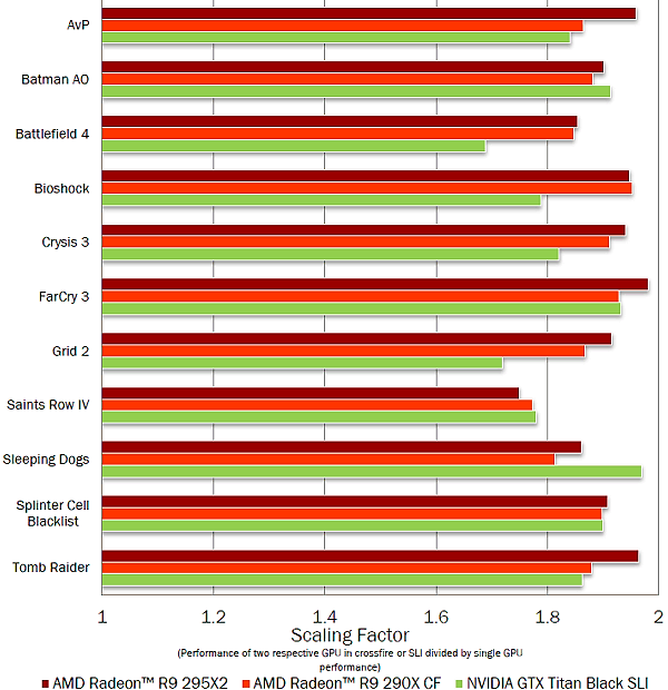 AMD сравнивает эффективность многочипового рендеринга для пары Radeon R9 290X, пары Geforce GTX Titan Black в SLI, а также для одной Radeon R9 295X2. Компания потратила немало времени на оптимизацию работы таких систем на базе нескольких GPU, поэтому они выжимают максимальную эффективность в большинстве приложений, близкую к 100%. Они даже честно указали пару примеров, где Nvidia SLI справляется эффективнее. Впрочем, обратных примеров больше, разумеется — ведь это данные AMD.