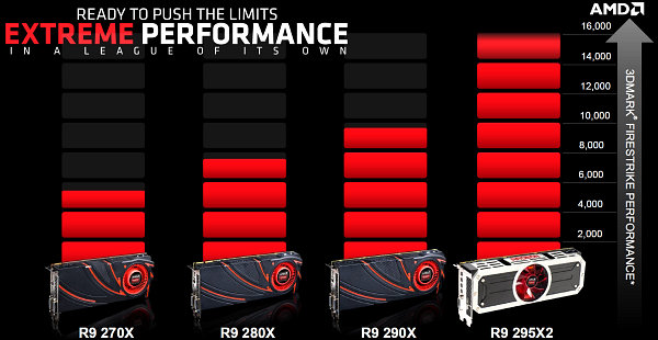 Позиционирование новинки понятно из диаграммы производительности в бенчмарке 3DMark Fire Strike, в которой представлены все верхние модели выпущенных компанией AMD подсерий видеокарт: R9 27x, R9 28x и R9 29x, только теперь к ним добавилась и двухчиповая R9 295X2. Естественно, что она сразу же стала лидером в линейке компании.