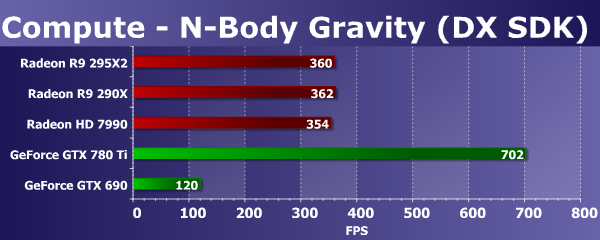 В этом тесте упор не только в скорость исполнения простых математических вычислений, но и в эффективности выполнения сложного кода с ветвлениями. Во втором DX11-тесте расклад сил между решениями разных компаний уже другой. Да и двухчиповый рендеринг в этом случае не работает что в случае платы Nvidia, что для Radeon R9 295X2. Платы Geforce в подобных расчетных задачах весьма неплохо смотрятся, но и новые Radeon также сносно справляются с ними — если бы AFR-рендеринг сработал нормально, то и для новинки все было бы неплохо.