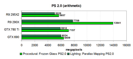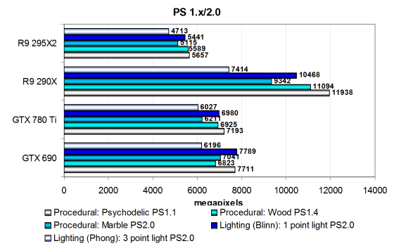 Производительность современных видеокарт в этих задачах ограничена скоростью текстурирования или филлрейта, но в данном случае никакого сравнения не получилось, вышедшая сегодня двухчиповая видеокарта AMD Radeon R9 295X2 в этом сравнении явно некорректно работает в CrossFire, поэтому даже одночиповому аналогу сильно уступила. Нет никакого смысла анализировать полученные данные. Посмотрим на результаты более сложных пиксельных программ промежуточных версий: