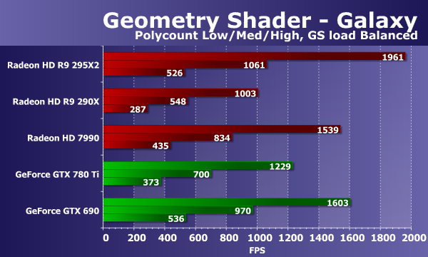 Сегодняшняя новинка Radeon R9 295X2 основана на Hawaii, который имеет оптимизации геометрического конвейера, поэтому он не уступает двухчиповой плате прошлого поколения компании Nvidia. У видеокарт Geforce с геометрической производительностью дела всегда были лучше, поэтому они оказываются быстрее, но новая модель Radeon основана на двух GPU, поэтому практически не уступает в этом тесте Geforce GTX 690. Посмотрим, как изменится ситуация при переносе части вычислений в геометрический шейдер: