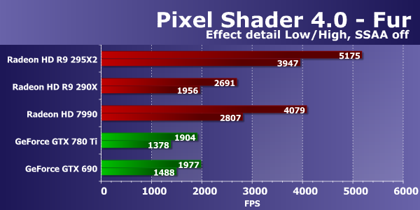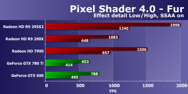 Во втором подтесте с более сложными попиксельными расчетами все уже сложилось иначе. Эффективность выполнения таких математических вычислений в пиксельных шейдерах у чипов архитектуры GCN заметно выше, чем у Kepler, поэтому платы Nvidia проигрывают и одночиповой Radeon R9 290X, не говоря уже о сегодняшней новинке. Модель Radeon R9 295X2 оказалась вдвое быстрее одночипового аналога, что близко к теории.