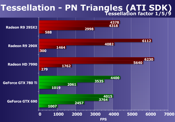 Видеокарты Geforce в этом тесте всегда очень быстры, но новинка в лице Radeon R9 295X2 показывает себя очень неплохо. Она примерно вдвое быстрее одночиповой платы Radeon аналогичной конфигурации, и ощутимо быстрее Radeon HD 7990 из предыдущего поколения. Понятно, что в сложных условиях представленная сегодня видеокарта проиграла обеим Geforce, но не слишком сильно. А так как в играх геометрическая нагрузка всегда ниже, то и возможностей новой видеокарты для них более чем достаточно.