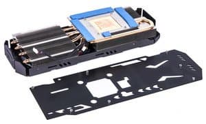 Для этого он должен быть массивным, иметь два радиатора, один из которых имеет большую пластину-основание (она прижимается к ядру и микросхемам памяти). А второй радиатор, соедиенный с первым тепловыми трубками, помогает понижать температуру, повышая эффективность работы СО. Силовые транзисторы имеют свои собственные небольшие радиаторы.