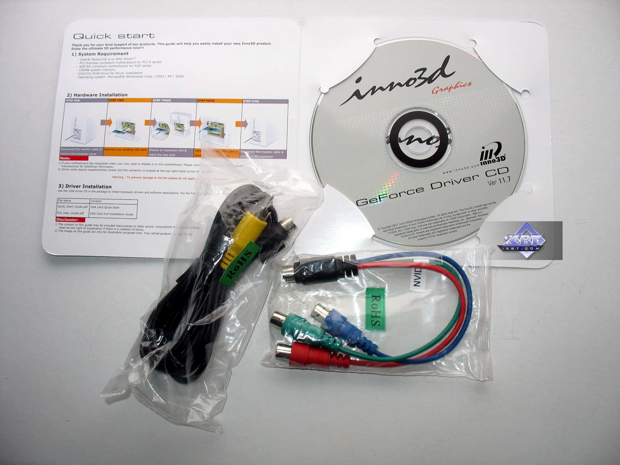 Базовый комплект поставки должен включать в себя: руководство пользователя, диск с драйверами и утилитами, переходник-адаптер DVI-to-VGA, DVI-to-HMDI адаптер, адаптер компонентного вывода (TV-out), а также разветвители внешнего питания и аудио-шнурок для соединения со звуковой картой (для передачи звука по HDMI). Далее мы покажем, что предлагается к каждой карте дополнительно.