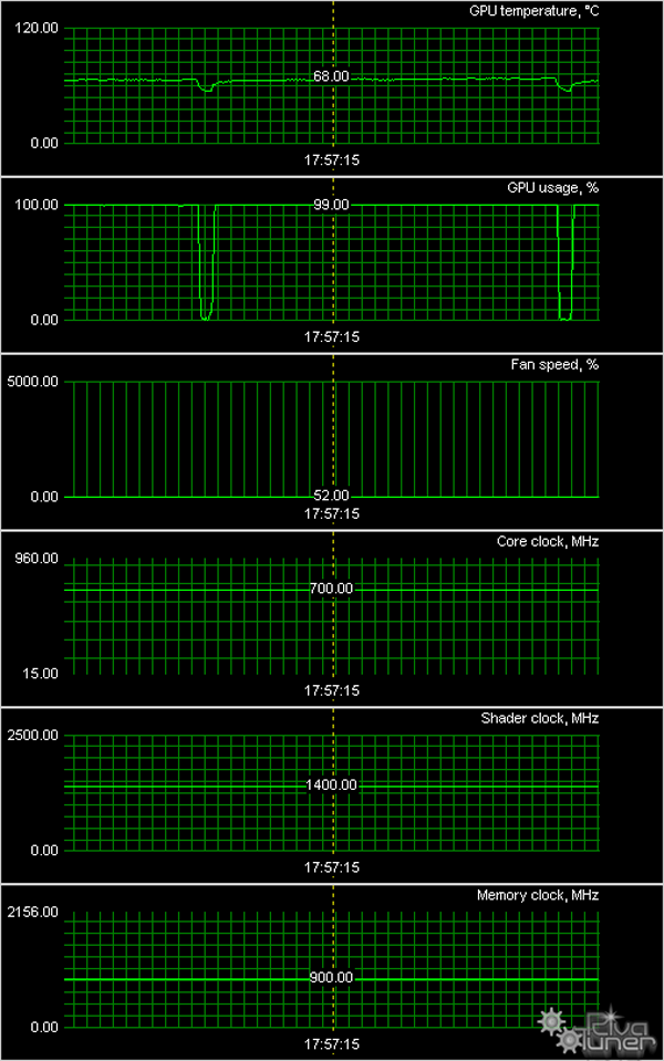 Мы провели исследование температурного режима с помощью утилиты EVGA (автор А. Николайчук AKA Unwinder) и получили следующие результаты: