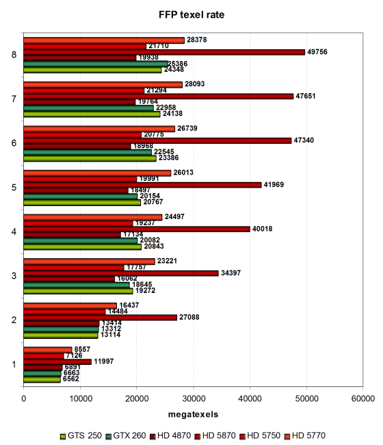 Хотя тест немного устарел, и в нём новые видеокарты уже не достигают теоретически возможных значений, расположение карт относительно друг друга по скорости текстурирования он показывает. Результаты синтетики не дотягивают до пиковых значений, и получается, что HD 5770 в этом тесте выбирает около 33 текселей за один такт из 32-битных текстур при билинейной фильтрации в этом тесте, что несколько ниже теоретической цифры в 40 отфильтрованных текселей.