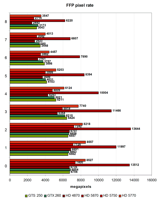 В тесте с небольшим количеством текстур скорость ограничивается ПСП, и HD 5870 не так уж силён в этих случаях, и лишь при 3-4 текстурах все решения выходят на свою номинальную мощность. Смотрим на эти же результаты в тесте филлрейта: