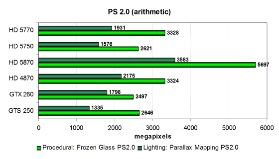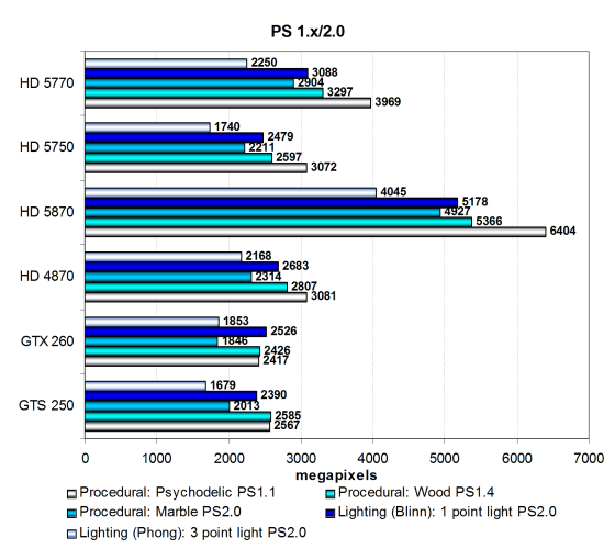 Ситуация похожая, но с текстурными выборками новые карты справляются чуть лучше, чем HD 4870, например. Обе модели показывают очень хорошие результаты. Старшая карта почти на уровне HD 4870, но в тесте parallax mapping из-за низкой ПСП она всё же отстаёт. Тут явно виден больший упор производительности в скорость текстурных блоков, так как GTS 250 выигрывает у GTX 260 в этих тестах. Но это даёт ей лишь равные с HD 5750 показатели. А вот HD 5770 заметно быстрее, чем GTX 260.