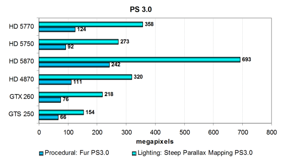 Оба PS 3.0 теста не ограничены пропускной способностью памяти и филлрейтом, они чисто математические. Это даёт возможность новым решениям показать всю свою силу. Ну а сильнейший участник HD 5870 далеко впереди, показывая вдвое больший результат по сравнению с HD 5770, что и должно быть, исходя из теории. Интересно, что результаты HD 4870 находятся как раз между результатами двух карт линейки HD 5700.