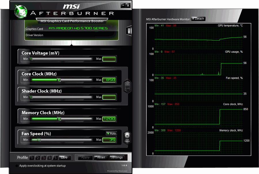 Стоит особо отметить утилиту Afterburner от MSI. Она базируется на RivaTuner (ее автор - тот же А.Николайчук), однако имеет более стильный и особый дизайн. Но принцип действия тот же - осуществлять изменение частот работы карты, мониторинг состояние продукта (температуры, частоты как работы карты, так и оборотов вращения вентилятора), управление кулером и т.д.