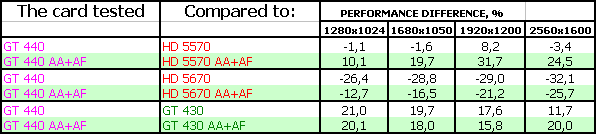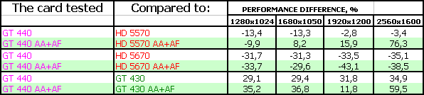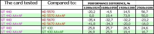 В данном материале мы не станем апеллировать к рейтингам полезности из наших выпусков i3D-Speed. Дело в том, что методика расчета рейтингов основана на тестах, проведенных при настройках максимального качества в играх, где такие карты, как GT 440, демонстрируют производительность подчас ниже минимального уровня играбельности. Для того, чтобы показать более объективную картину только внутри семейства видеоускорителей Low-End, мы работаем над особой методикой их тестирования. Нынешняя методика, применяемая для всех карт подряд, основана, еще раз повторю, на тестировании с настройками на максимальное качество в играх и иных бенчмарках. Она позволяет увидеть, на каком месте находится и как соотносится по скорости бюджетный продукт по сравнению с топовым. Она также позволяет показать соотношение сил между конкурентами внутри сегмента, однако не дает объективной картины в плане полезности, ибо требования сквозной методики, предъявляемые к ускорителю класса Low-End, чрезвычайно высоки, и даже низкая цена не дает им состязаться полноценно.
