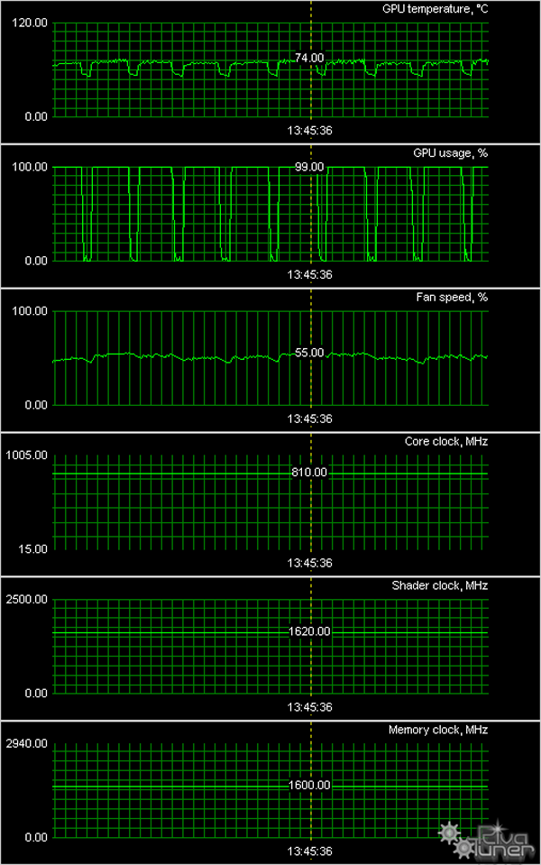 Мы провели исследование температурного режима с помощью утилиты MSI Afterburner (автор А. Николайчук AKA Unwinder) и получили следующие результаты: