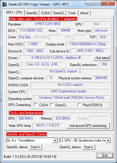 Утилита CPU-Z пока мало что может сказать о Zacate, но частоту CPU определила правильно, а также набор поддерживаемых инструкций и размер кэшей. Инженерный образец APU видится утилитой не как двухъядерный процессор, а как двухпроцессорная система. В остальном — любопытен набор инструкций, в нём теперь есть SSSE3 и SSE4A, но нет 3DNow!. Зато поддерживаются 64-битные инструкции и технология виртуализации.
