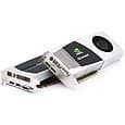 Концептуальные отличия от игровых карт не заканчиваются на внутреннем устройстве, но проявляются и в особенностях коммутации карт серии Quadro с внешним миром. Для связи с «совсем внешним» применяются разъем DVI-I Dual-link и два порта DisplayPort, каждый из которых поддерживает разрешение до 2560×1600 точек. В игровые карты поддержка трех мониторов пришла, напомним, лишь год назад, ну а профессиональные модели с необходимой функциональностью продавались и ранее :) Нашлось на задней панели и место для (относительной) экзотики — разъема для стереоочков.