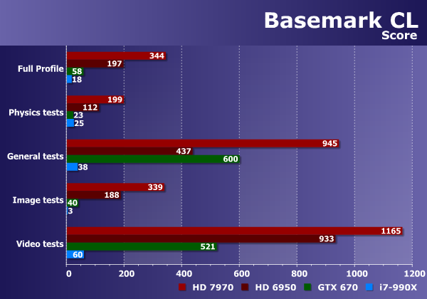 При сравнении графических процессоров AMD и Nvidia в этом бенчмарке явно выигрывают платы Radeon, причем даже предыдущего поколения! Кроме одного («General») набора подтестов, даже Radeon HD 6950 оказался быстрее, чем Geforce GTX 670. Что уж говорить о Radeon HD 7970, который обогнал конкурента минимум в два раза. Похоже, что тесты в данном бенчмарке лучше оптимизированы для графических архитектур компании AMD. Рассмотрим набор общих и физических тестов по отдельности: