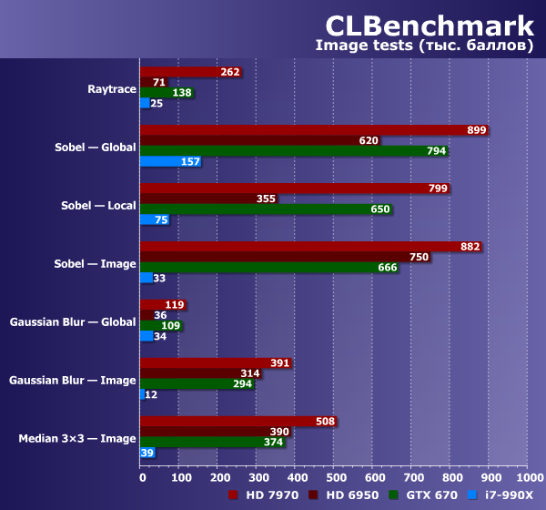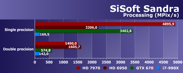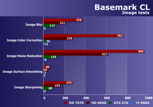Очень сложно сравнивать мощнейшие GPU с явно не подходящим для таких задач универсальным процессором на одной диаграмме — столбики CPU на ней просто не видны. Графические же чипы при обработке изображений чувствуют себя как рыба в воде, а лучший из них (Radeon HD 7970) опережает универсальный вычислитель в сотню раз!